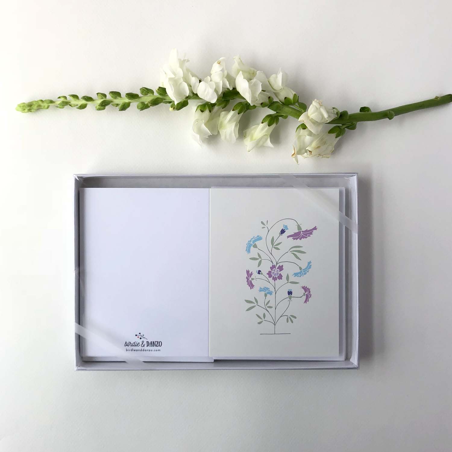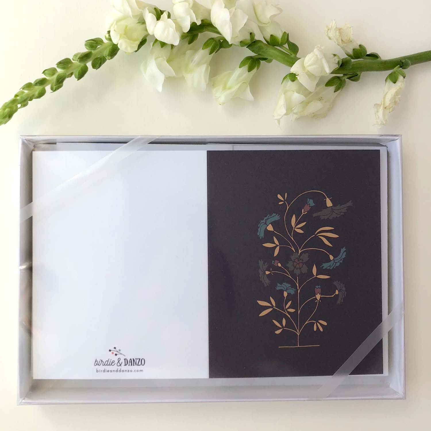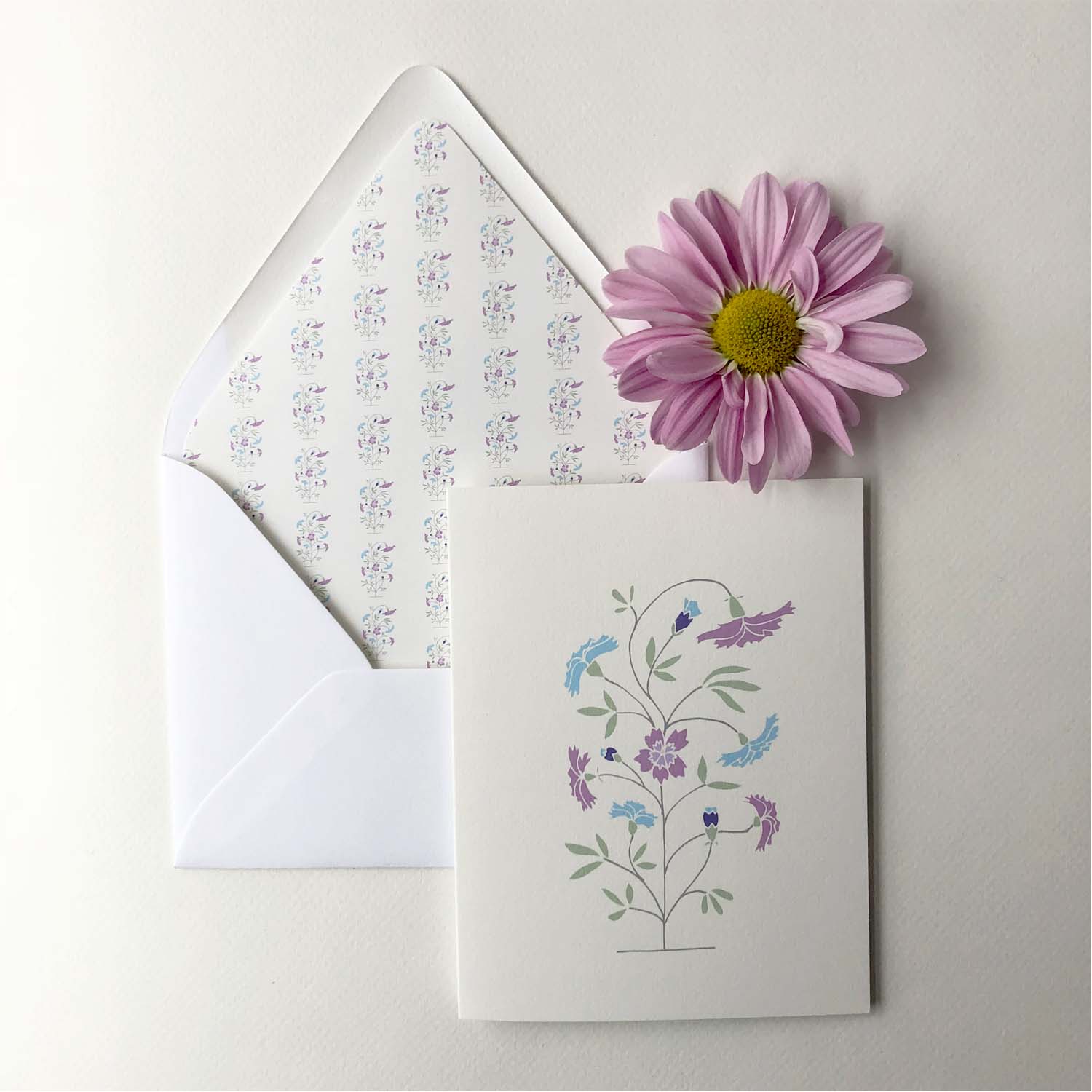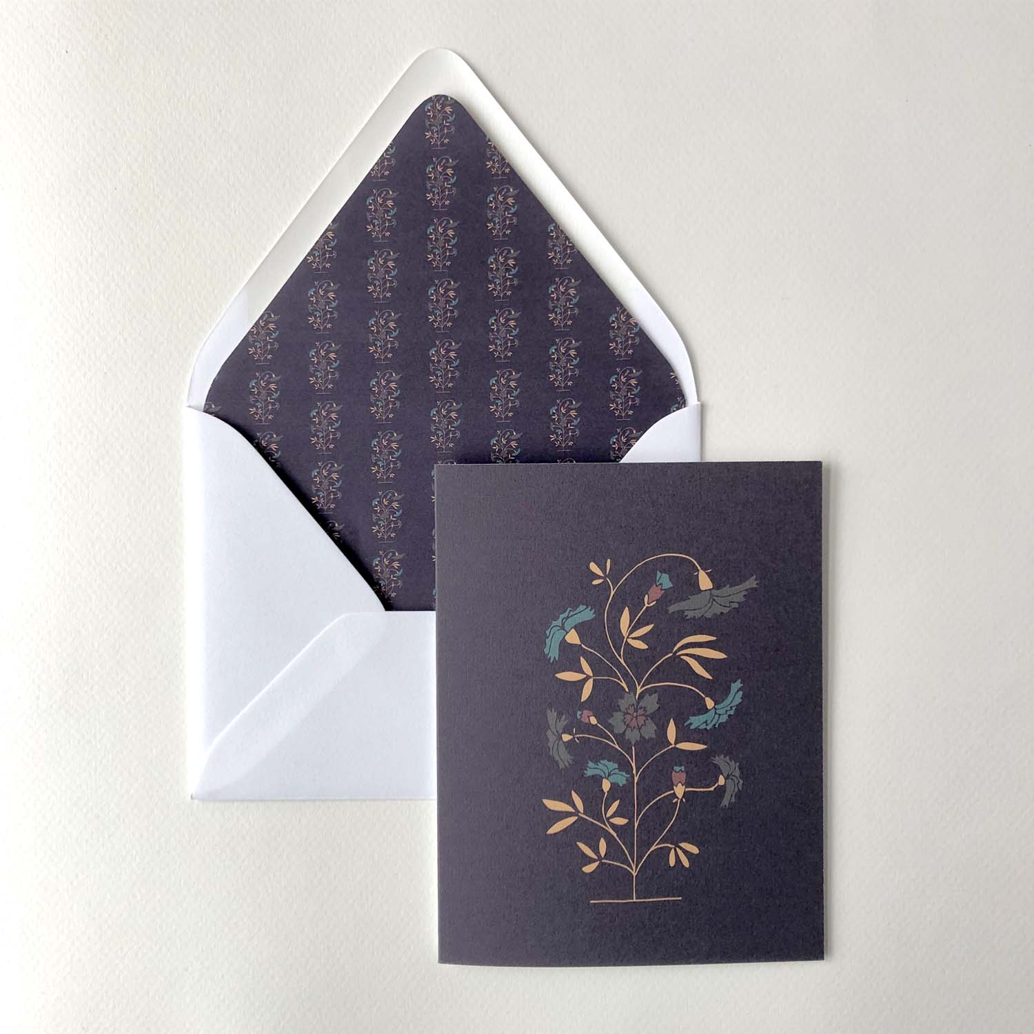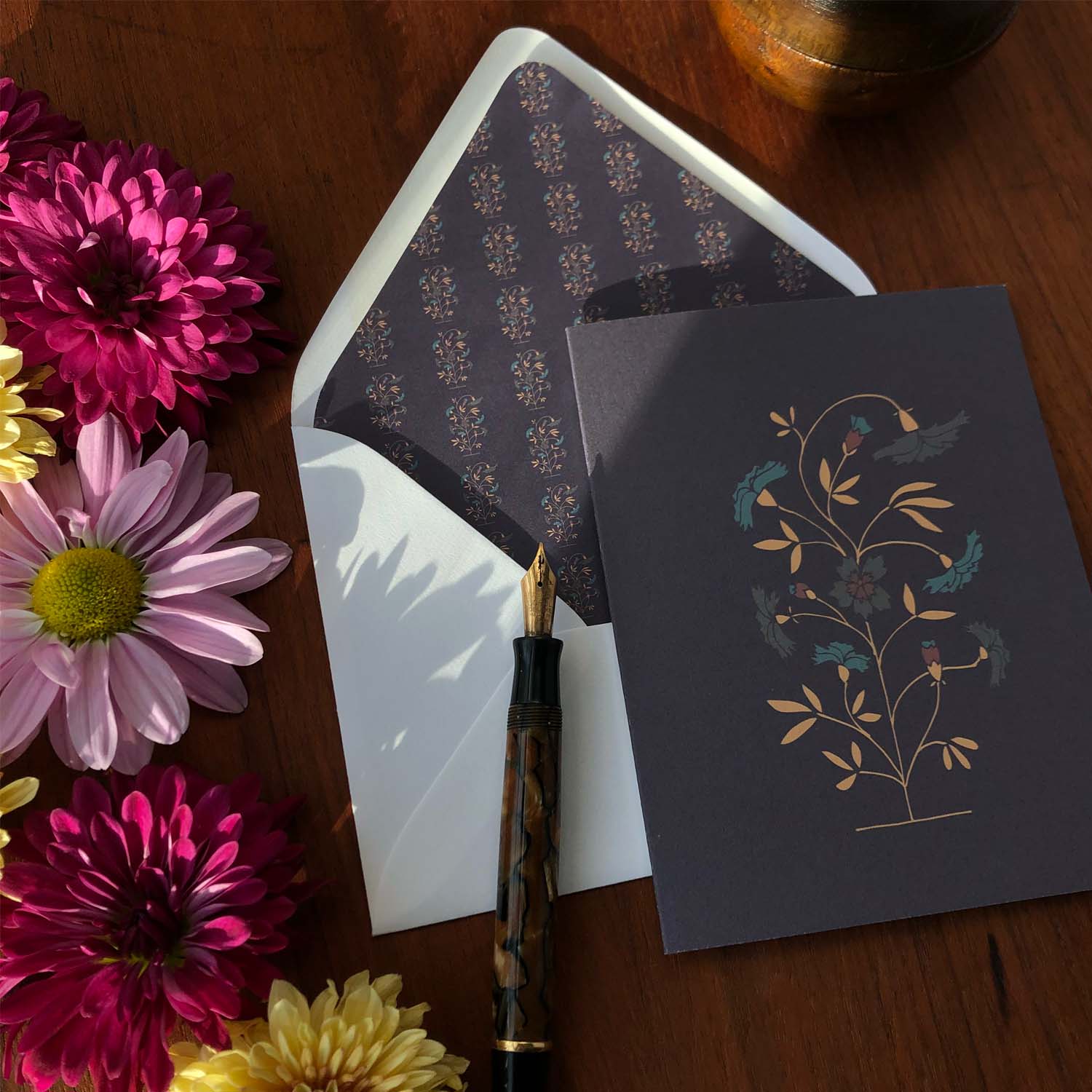 Send a heartfelt message with these folded greeting cards, designed with a full plant boteh illustration on the front and a blank interior for your personal notes. Perfect for penning your thoughts to a loved one or showing appreciation, they make staying connected a beautiful experience. Each set includes coordinating patterned envelope liners for an extra touch of charm. Choose from two color options: antique silk or nocturne.
