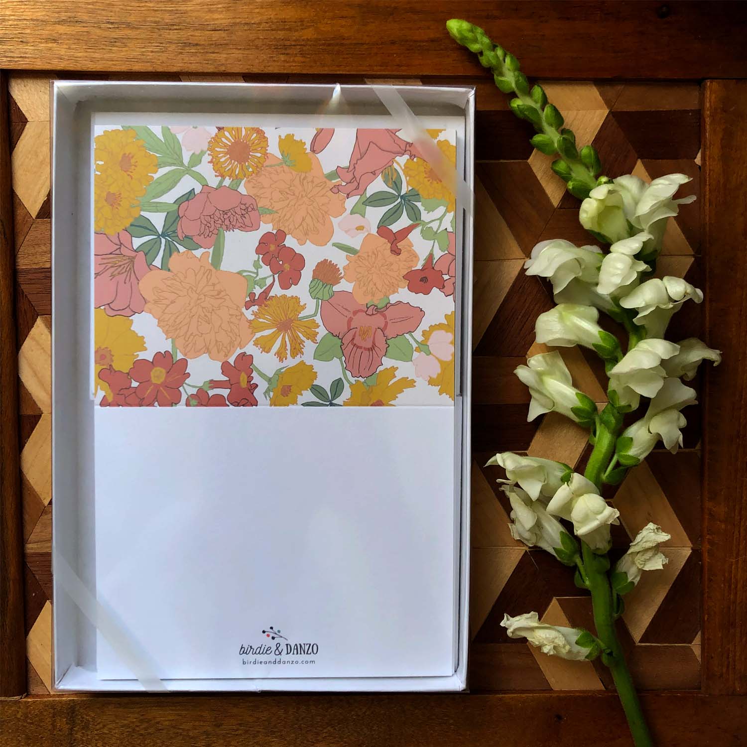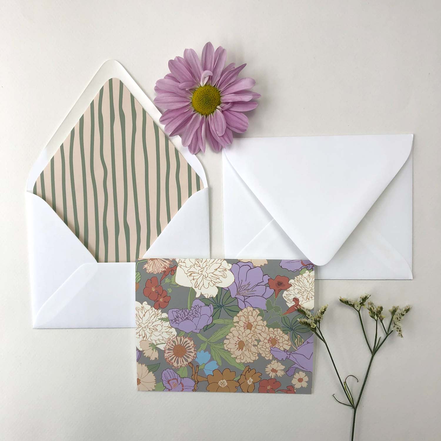 Send a heartfelt message with these folded greeting cards, designed with a full floral pattern front and a blank interior for your personal notes. Perfect for penning your thoughts to a loved one or showing appreciation, they make staying connected a beautiful experience. Each set includes coordinating patterned envelope liners for an extra touch of charm. Choose from two color options: the sunny Golden Petals or misty Lavender Breeze.