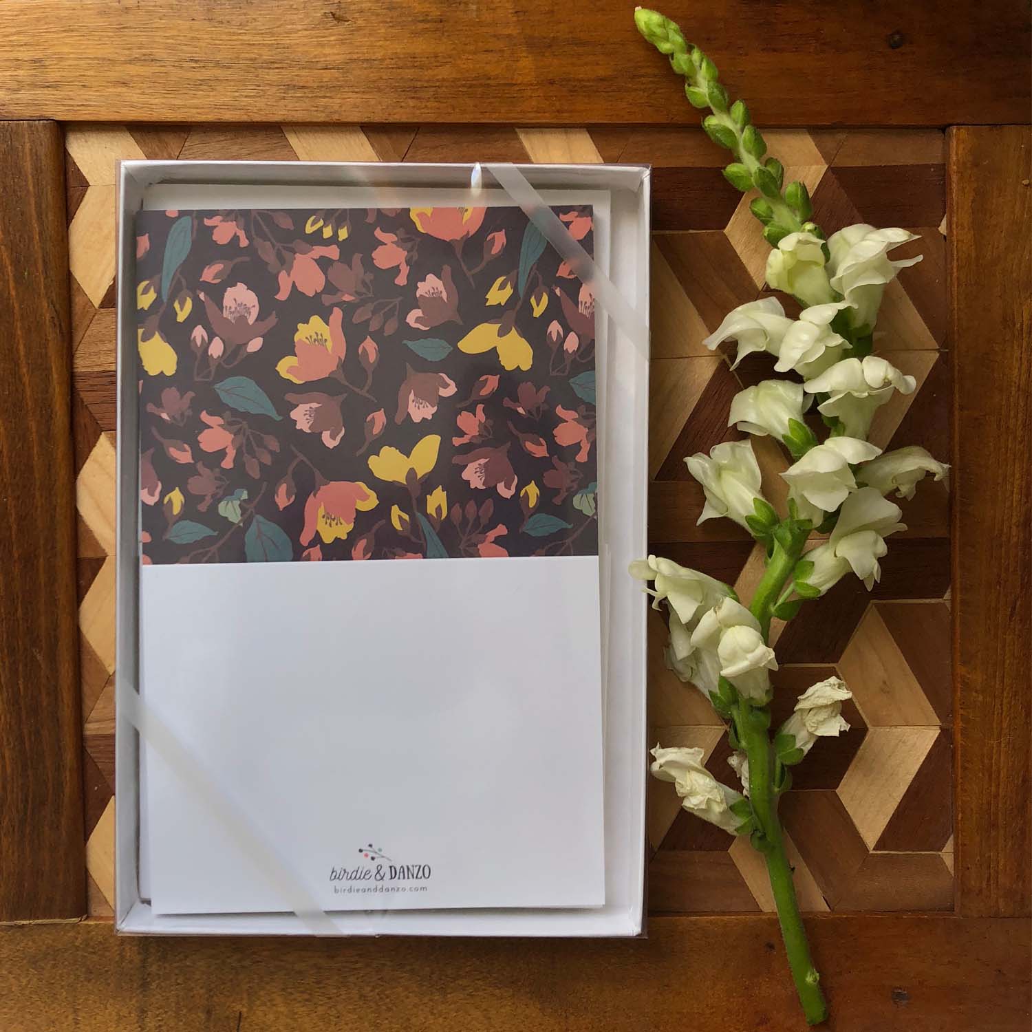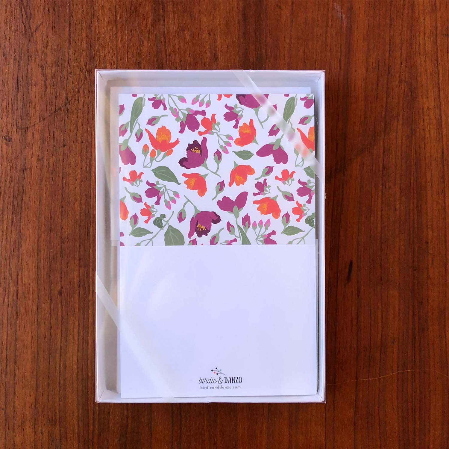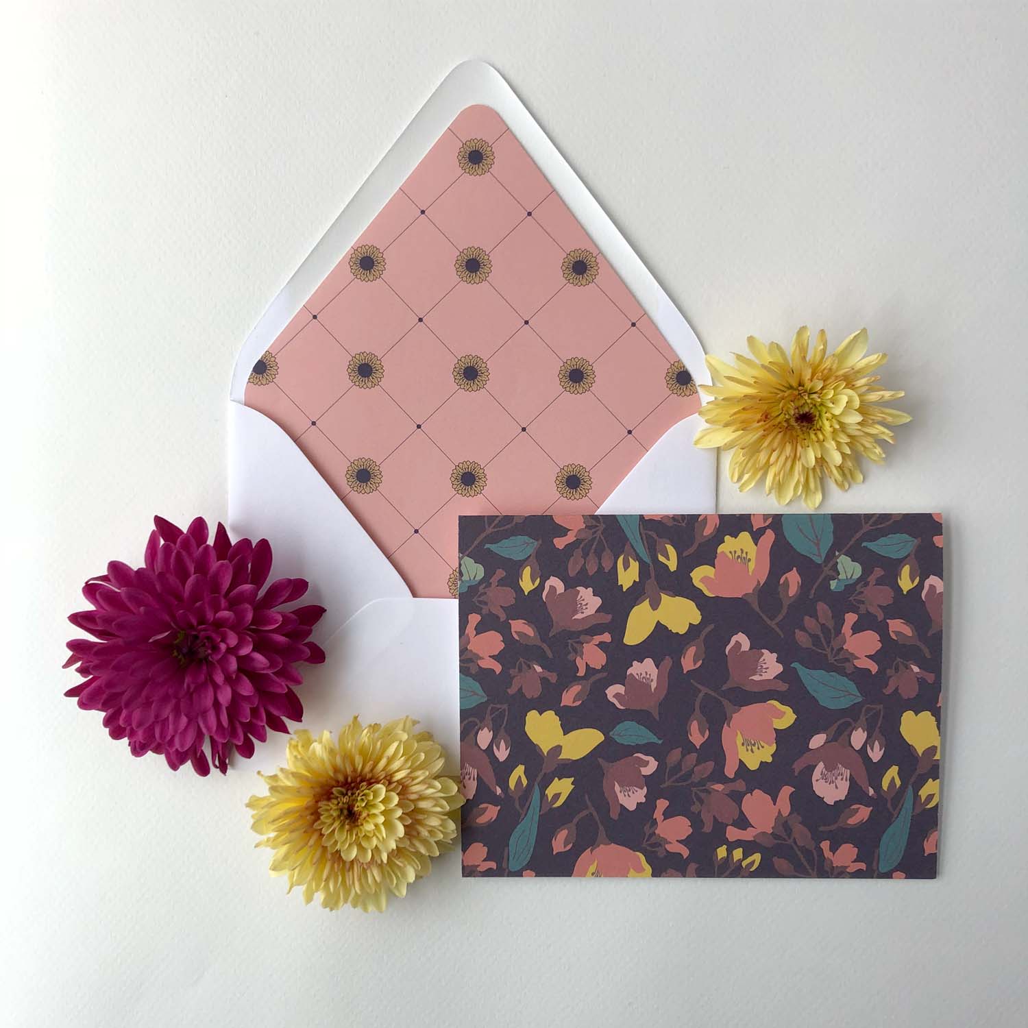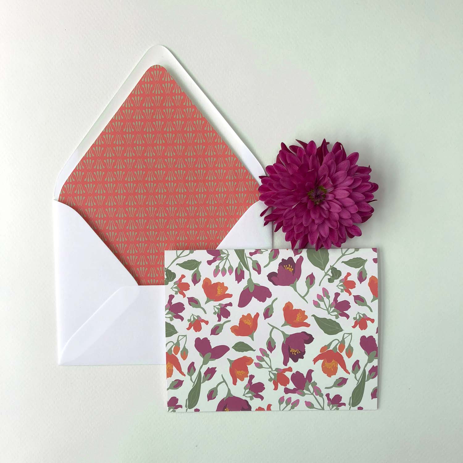 Send a heartfelt message with these folded greeting cards, designed with a full tossed floral pattern on the front and a blank interior for your personal notes. Perfect for penning your thoughts to a loved one or showing appreciation, they make staying connected a beautiful experience. Each set includes coordinating patterned envelope liners for an extra touch of charm. Choose from two color ways: the jubilantly bright Cotton Blossom or the elegantly moody Dusky Plum.