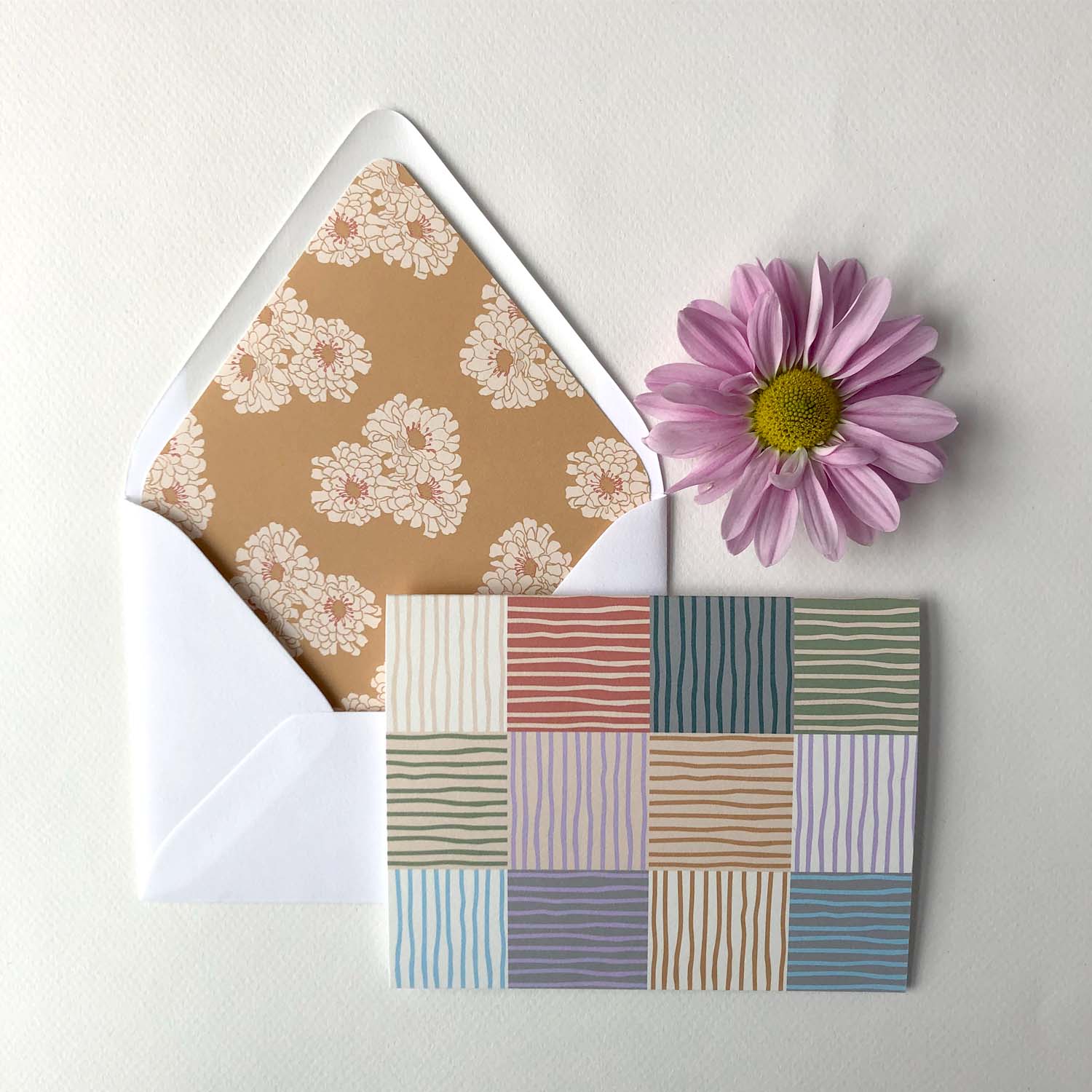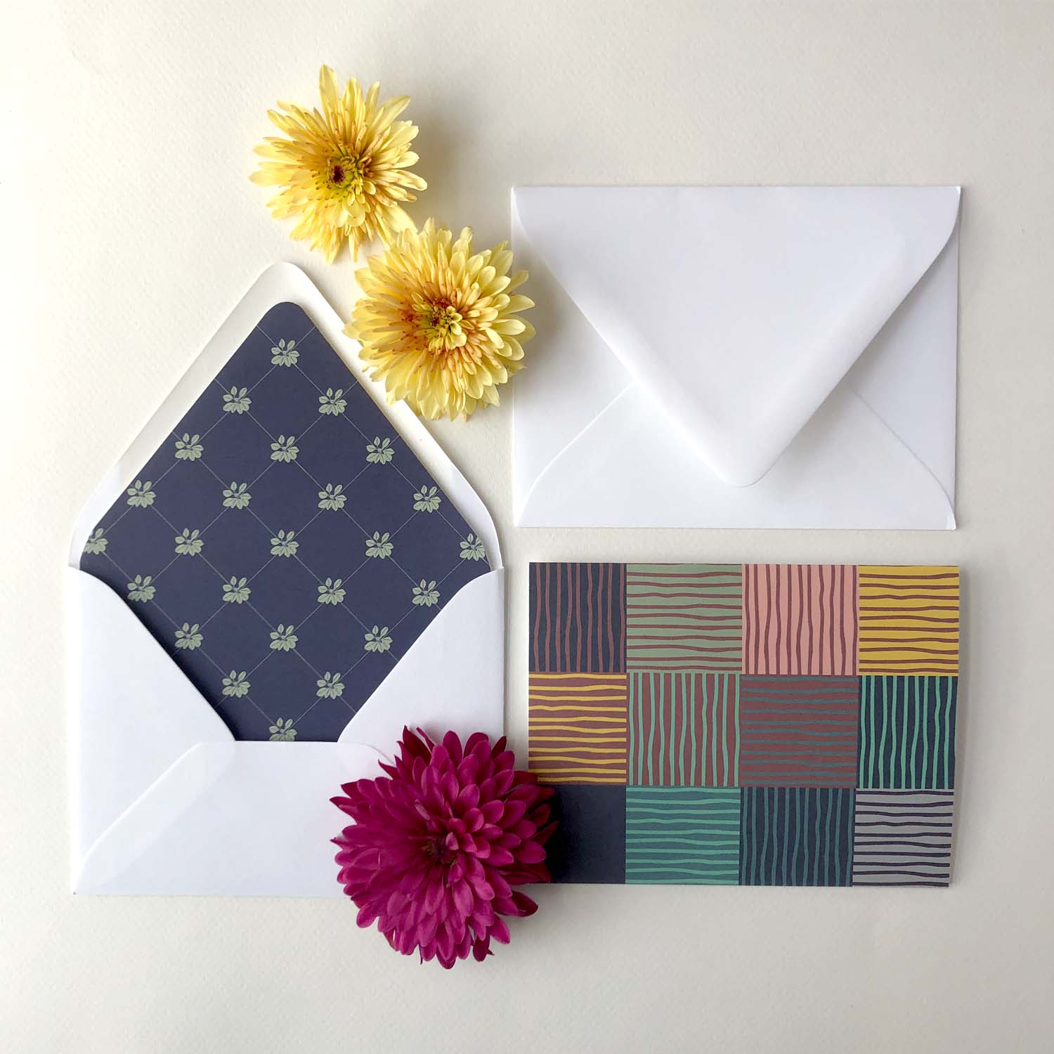 This pattern arose from the iteration process of choosing the color combination of the striped envelope liners for the Mixed Floral cards. I tried so many color combinations and they looked so beautiful next to each other in little patchwork squares the concept for the pattern just leapt out at me.